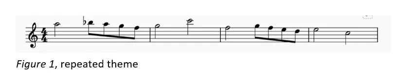 What makes Whisper of the Heart noteworthy is its soundtrack. Unlike the ‘blended composite score’ (Psujek, 3) – the term Psujek uses to describe soundtracks featuring both original and pre-existing works, ‘Country Roads’ is the only pre-existing piece of music on the film’s soundtrack. Yuji Nomi’s original work for the score functions similarly to the classical Hollywood scoring; there is an unmissable leitmotif appearing frequently throughout the film’s second half. First appearing in ‘Flowing Clouds Atop the Shining Hills’, this short theme (see figure 1) then features in five further tracks in alternate forms.